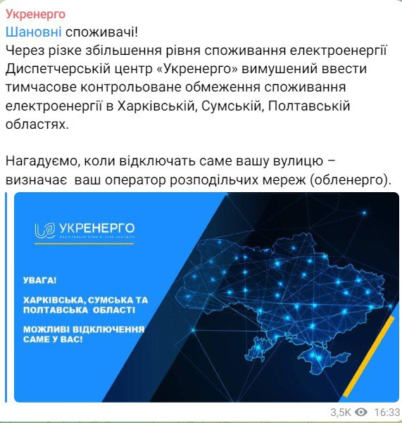 "Из-за резкого увеличения уровня потребления электроэнергии Диспетчерский центр "Укрэнерго" вынужден ввести временное контролируемое ограничение потребления электроэнергии в Харьковской, Сумской, Полтавской областях. Напоминаем, когда отключат именно вашу улицу – определяет оператор распределительных сетей (облэнерго)", - говорится в сообщении "Укрэнерго".