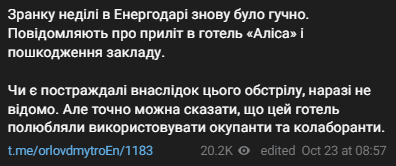 В захваченном россиянами Энергодаре Запорожской области  под обстрел попал отель "Алиса".