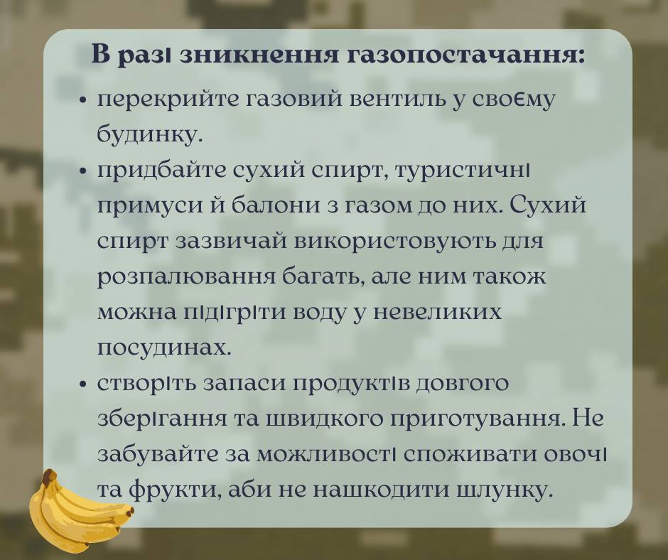 На случай отключений газа в КГВА рекомендуют закупить сухой спирт и подготовить продукты быстрого приготовления, а также те, которые долго хранятся.