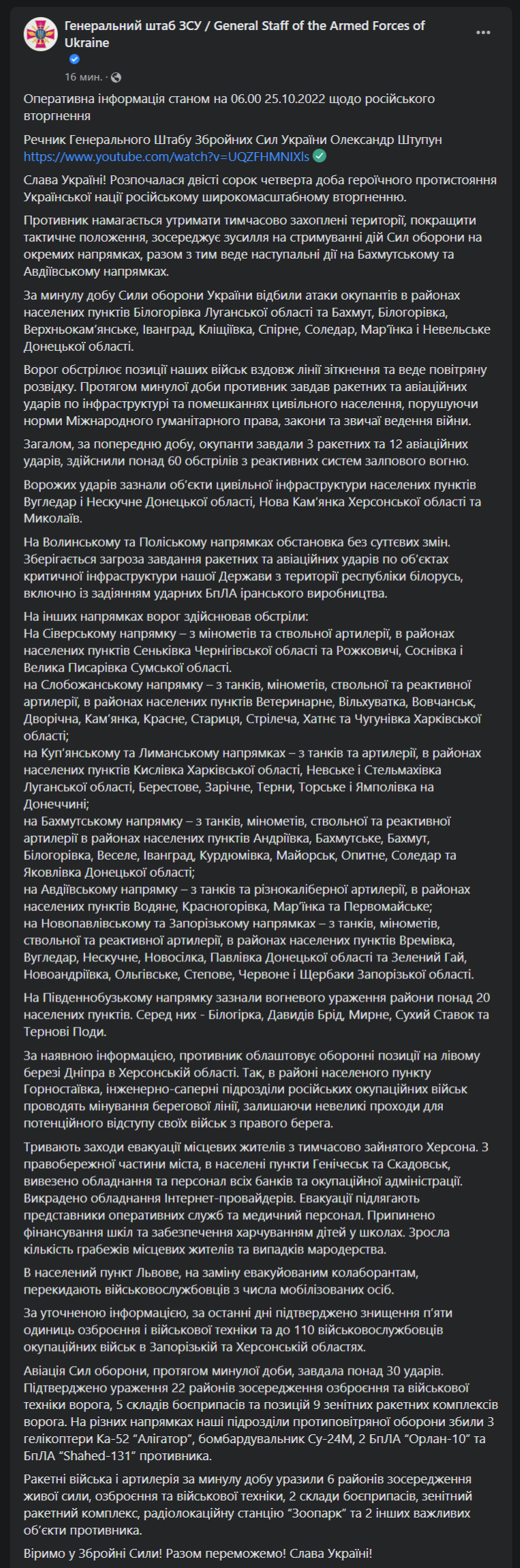 07:17 Сводка украинского Генштаба на утро 25 октября.