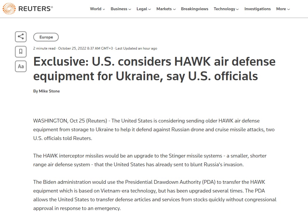 09:43 США рассматривают возможность поставки ПВО HAWK для Украины, пишет Reuters со ссылкой на информацию от официальных лиц США.