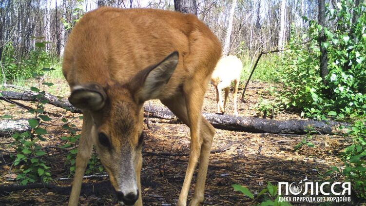 Также в зоне отчуждения ЧАЭС в кадр попадали два непуганых оленя, перебегавших дорогу.
