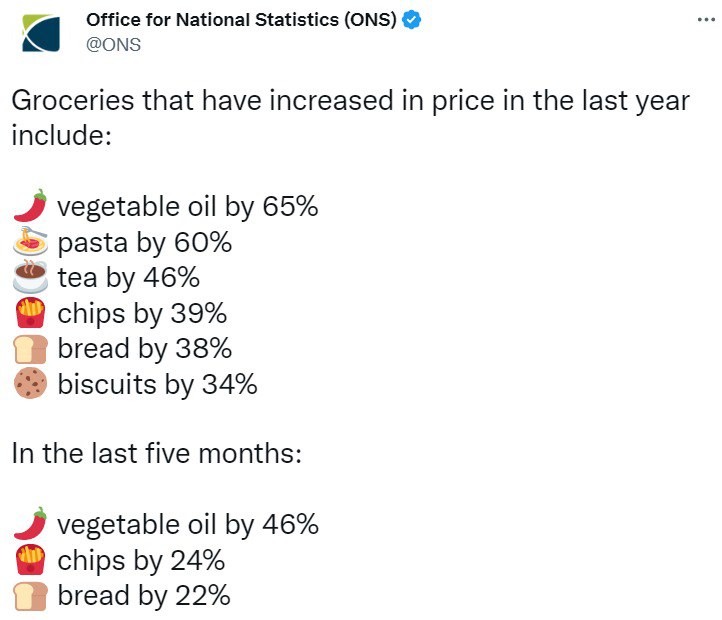 Британский офис национальной статистики Великобритании публикует официальные данные о том, какие продукты подорожали сильнее всего в королевстве за последний год.