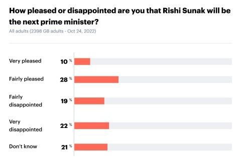 38% британцев рады, что Риши Сунак стал новым премьер-министром, 41% разочарованы, а 21% затруднились с ответом.
