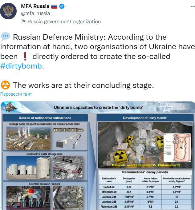 МИД опубликовало твит со ссылкой на Минобороны России, что якобы "двум организациям Украины было прямо приказано создать т.н. грязную бомбу". К твиту ведомство приложило слайд Министерства обороны России.
