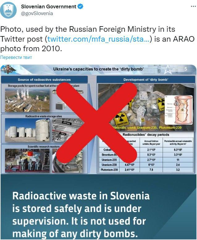 Однако позже правительство Словении сообщило в Твиттере, что на слайде для иллюстрации подготовки "грязной бомбы" была использована фотография словенского Агентства по радиоактивным отходам 2010 года.