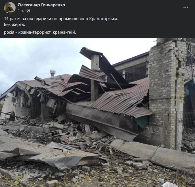 Тем временем на подконтрольной части Донецкой области обстрелу подвергся Краматорск. Россияне выпустили 14 ракет по промышленным объектам, сообщил мэр города Александр Гончаренко и опубликовал фото последствий.