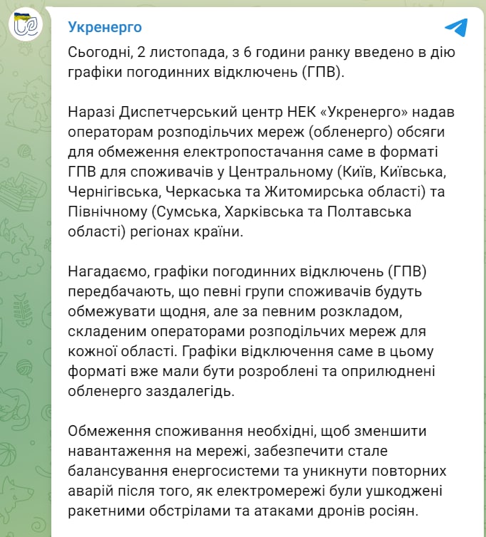 11.40 В ряде областей вводят отключения света, сообщают в Офисе президента.