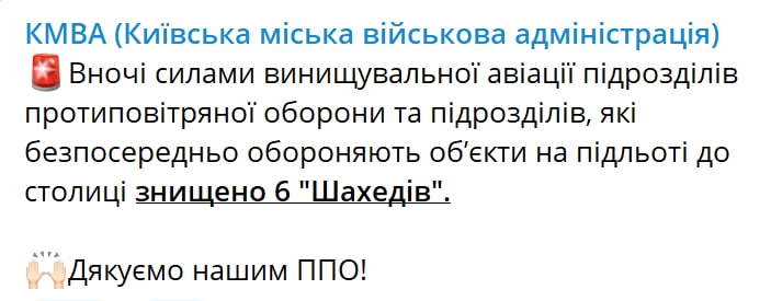 8:48 Ночью на подлете к столице было сбито шесть беспилотников-камикадзе "Шахид".