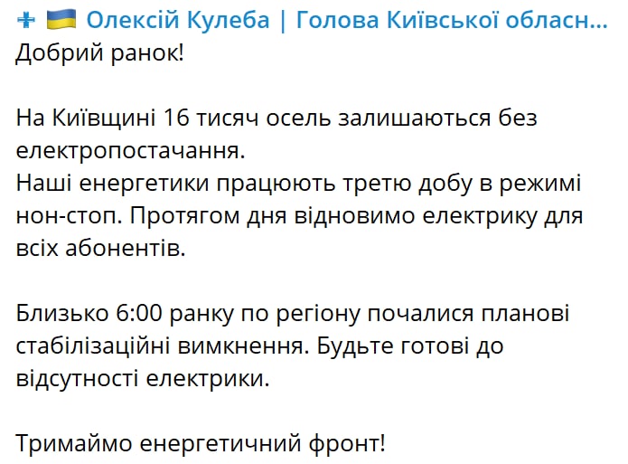 9:12 Губернатор Киевской области Кулеба призвал быть готовыми к отключениям электричества.