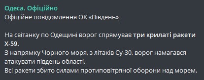 10:20 Над Черным морем в районе Одесской области сбиты три крылатые ракеты Х-59, сообщает Оперативное командование "Юг".