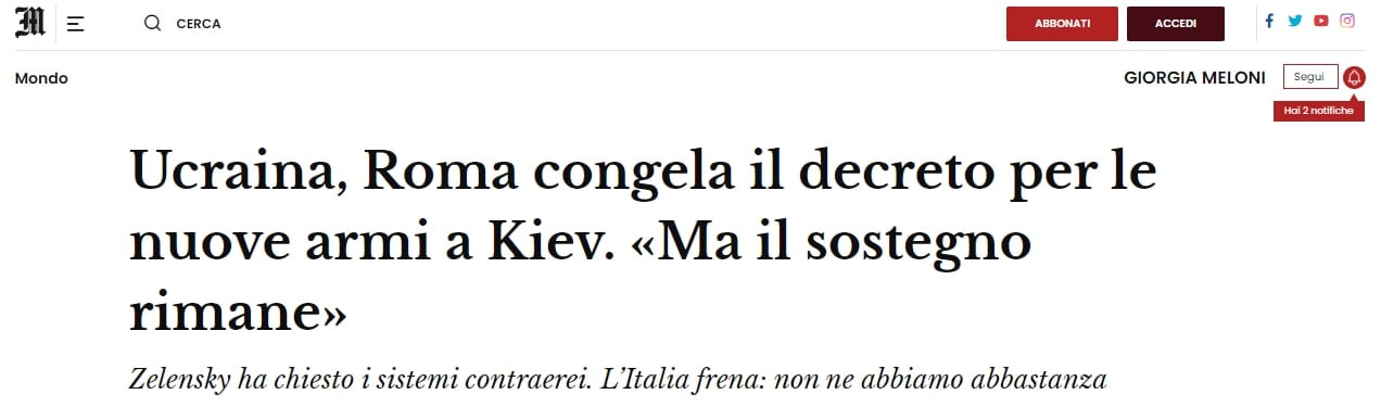 "Несмотря на слухи последних дней, вызванные настойчивой просьбой президента Владимира Зеленского о новых системах ПВО, защитить Киев и другие украинские города, Рим замораживает новые поставки", - пишет газета.