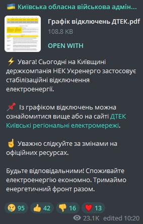 11:13 В Киевской области Укрэнерго применяет стабилизационные отключения, сообщает Киевская областная военная администрация.