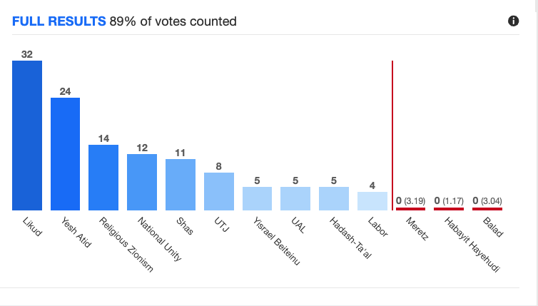 По предварительным данным, наибольшее количество мандатов - 32 - достанется национал-либеральной партии Нетаньяху "Ликуд".