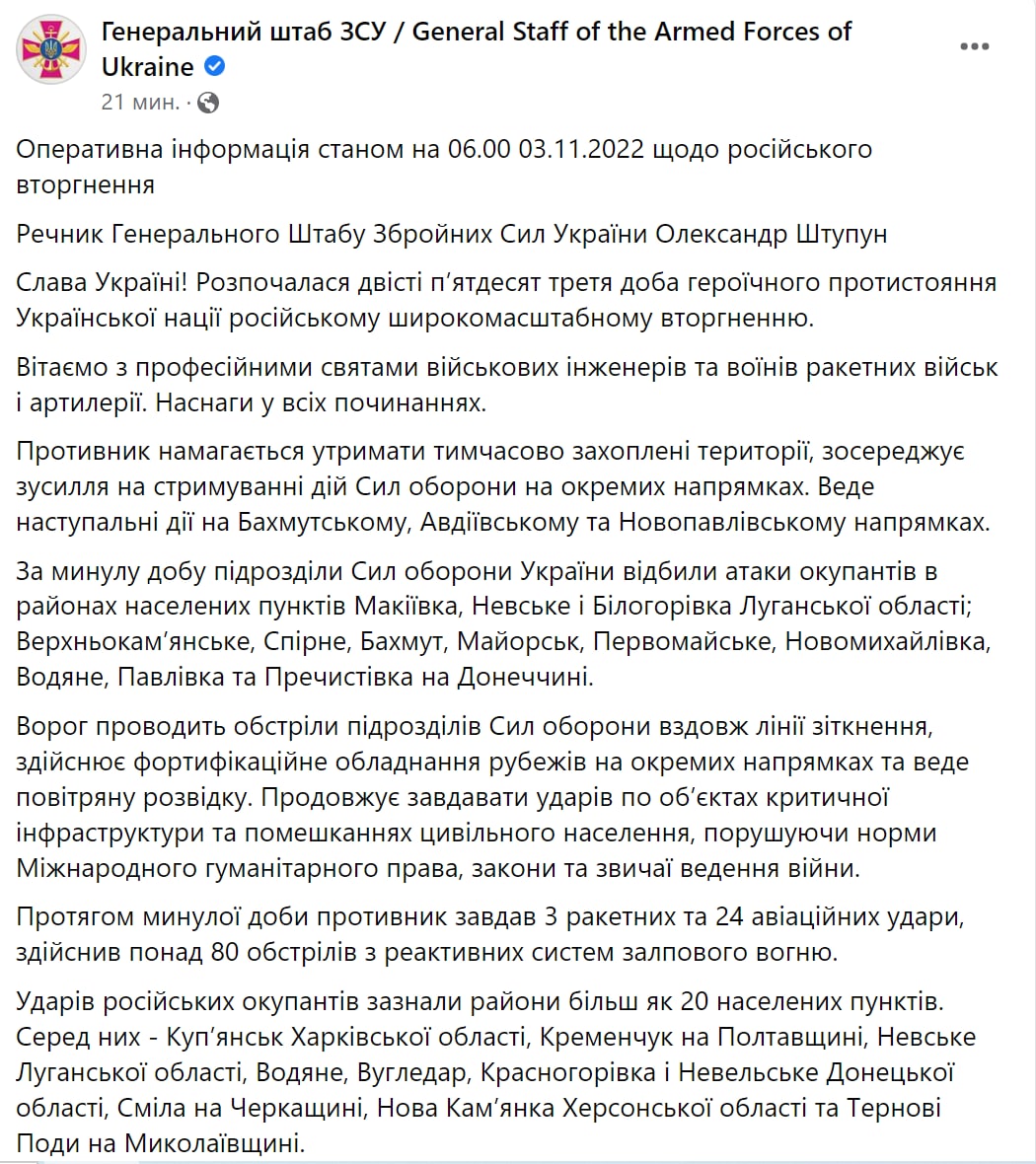 В четверг, 3 ноября, в Украине идет уже 253-й день войны с РФ.