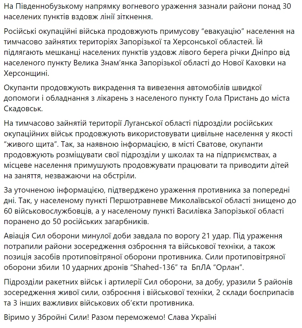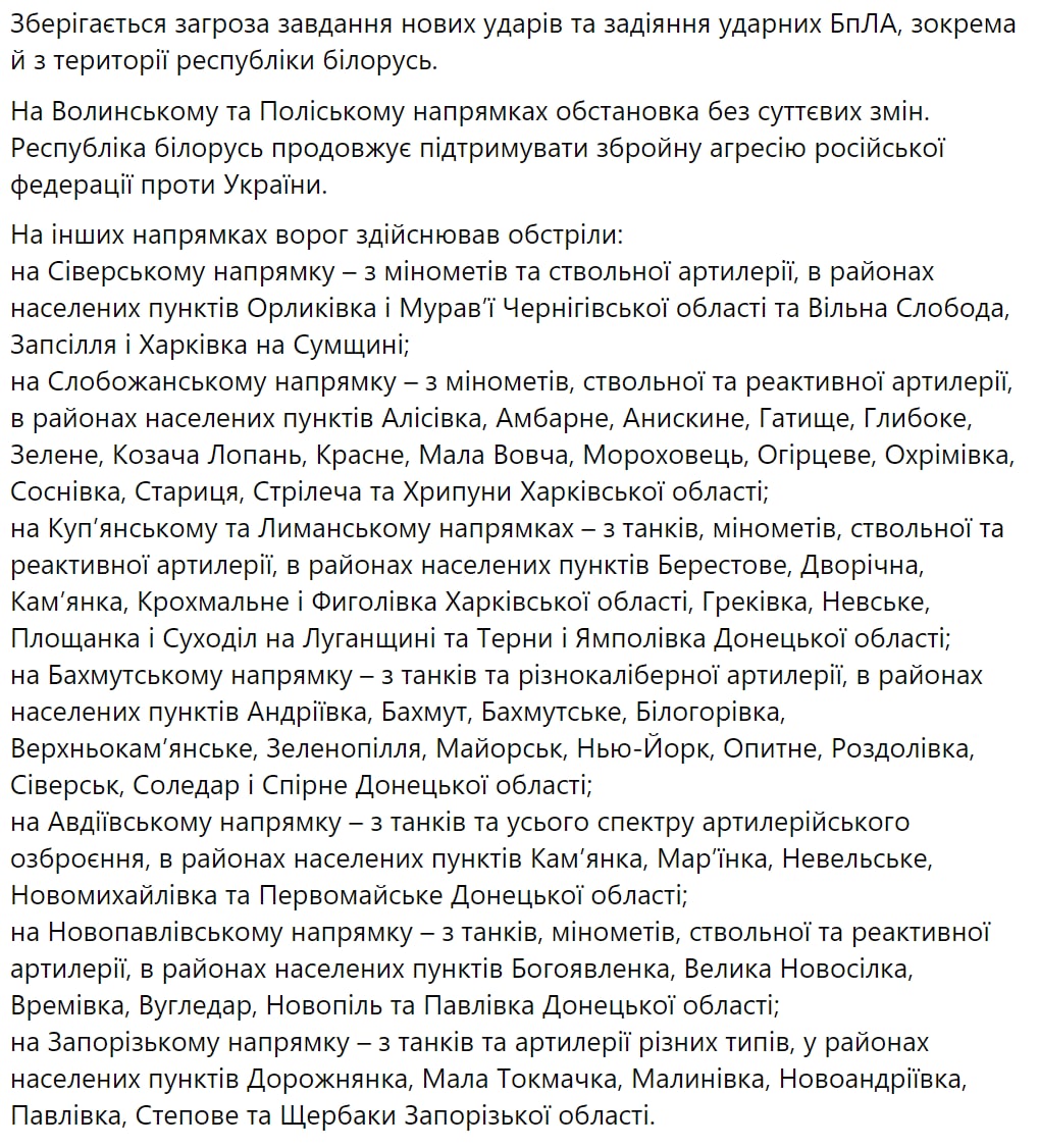 1. Отражены атаки россиян в районах населенных пунктов: Макеевка, Невское и Белогоровка Луганской области; Верхнекаменское, Спорное, Бахмут, Майорск, Первомайское, Новомихайловка, Водяное, Павловка и Пречистовка Донецкой области.