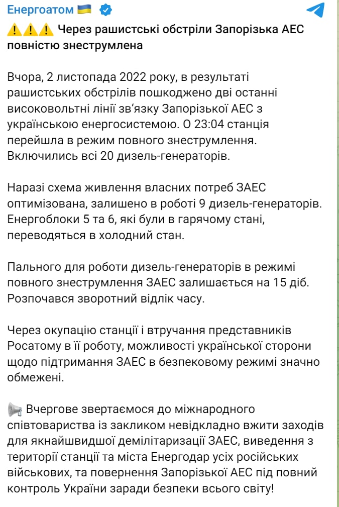 "Энергоблоки 5 и 6, находящиеся в горячем состоянии, переводятся в холодное состояние. Горючего для работы дизель-генераторов в режиме полного обесточивания ЗАЭС остается на 15 суток. Начался обратный отсчет времени", - сообщили в компании.