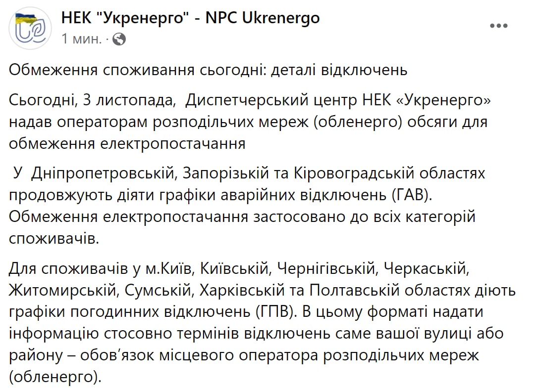 8:15 "Укрэнерго" опубликовало схему, как будут отключать свет 3 ноября.