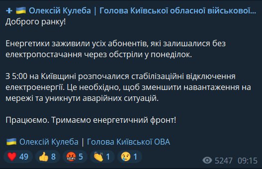 9:23 В Киевской области сегодня с 5 утра начались стабилизационные отключения света, сообщил глава Киевской военной администрации Алексей Кулеба.