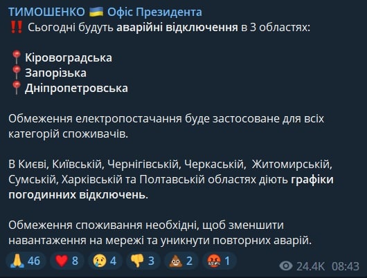 Видимо, это связано с ночным ударом по энергетической инфраструктуре в Кривом Роге.