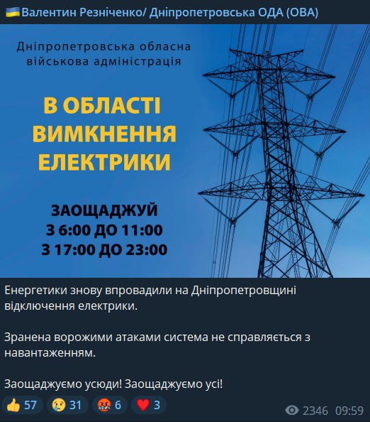 10:05 В Днепропетровской области вводятся отключения электроэнергии, сообщил глава Днепропетровской ОГА Валентин Резниченко.