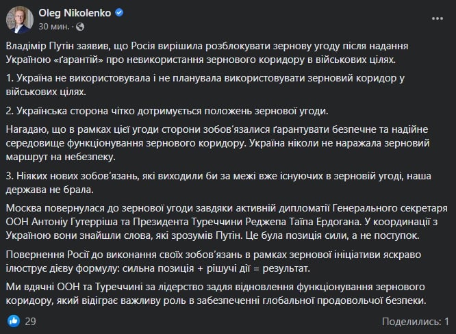 Так Николенко отреагировал на заявление Путина о том, что РФ решила разблокировать сделку после предоставления Украиной гарантий, что маршрут не будет использоваться в военных целях.