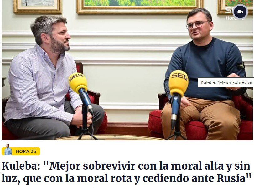 10:33 Отключение электроэнергии и возможность оставаться дома без света предоставляют возможность "заниматься любовью и наслаждаться жизнью", заявил глава МИД Украины Дмитрий Кулеба в интервью испанской радиостанцией Cadena SER, отвечая на вопрос про ситуацию с перебоями электроснабжения.