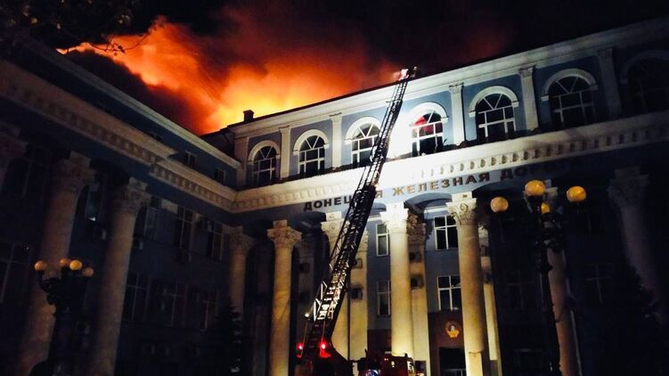 В оккупированном Донецке под обстрел попало здание управления железной дороги в самом центре города на улице Артема. Масштабный пожар тушили всю ночь.