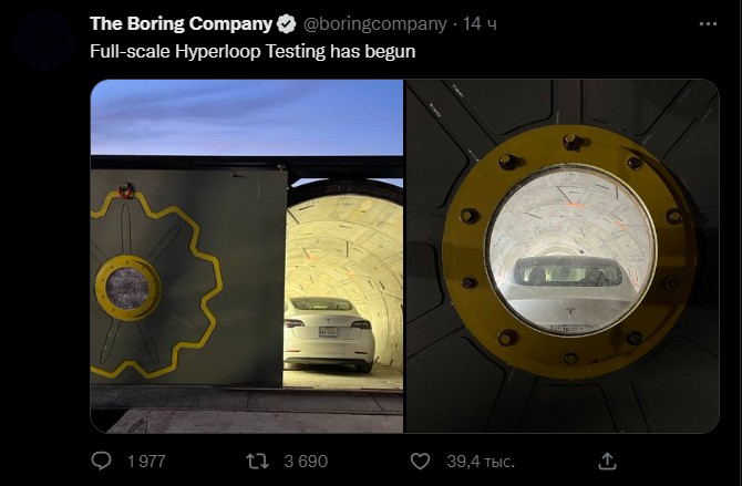 Компания американского бизнесмена Илона Маска The Boring Company заявила о старте полномасштабных испытаний системы сверхскоростных поездов Hyperloop.