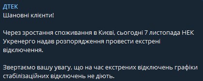 В связи с ростом потребления электроэнергии в Киеве, в понедельник, 7 ноября, компания "Укрэнерго" распорядилась провести экстренные отключения в столице.
