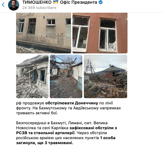 "Непосредственно в Бахмуте, Лимане, пгт Большая Новоселка и селе Карловка зафиксированы обстрелы из РСЗО и ствольной артиллерии. Из-за обстрелов российской армией этих населенных пунктов 1 человек погиб, еще 3 травмированы", - пишет Тимошенко.