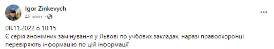 "Есть серия анонимных минирований во Львове по учебным заведениям, в настоящее время правоохранители проверяют информацию", - написал он.