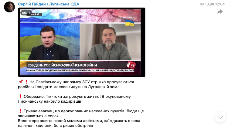 Губернатор Луганской области Сергей Гайдай заявил о "стремительном продвижении" ВСУ в направлении Сватово.