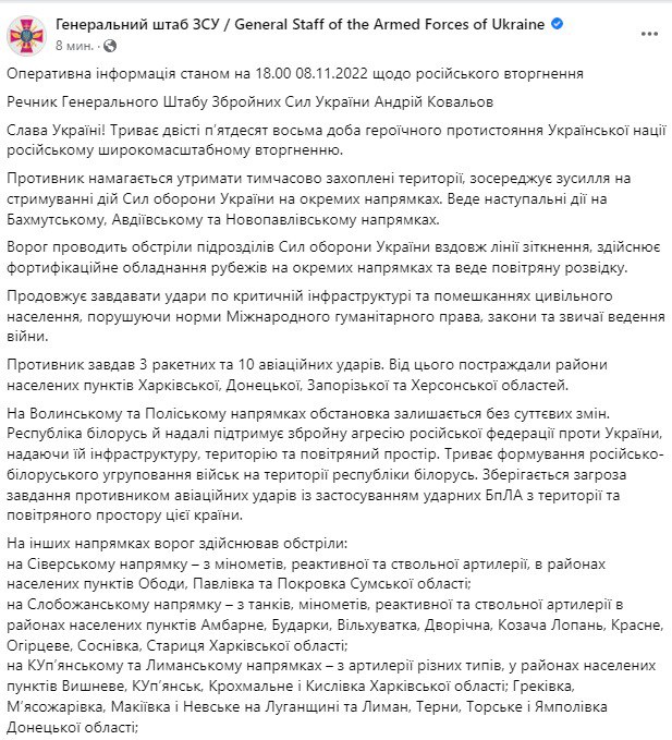 Вечером во вторник, 8 ноября, Генштаб ВСУ опубликовал актуальную сводку с фронта. Сообщается, что противник продолжает вести наступательные действия на Бахмутском, Авдеевском и Новопавловском направлениях.