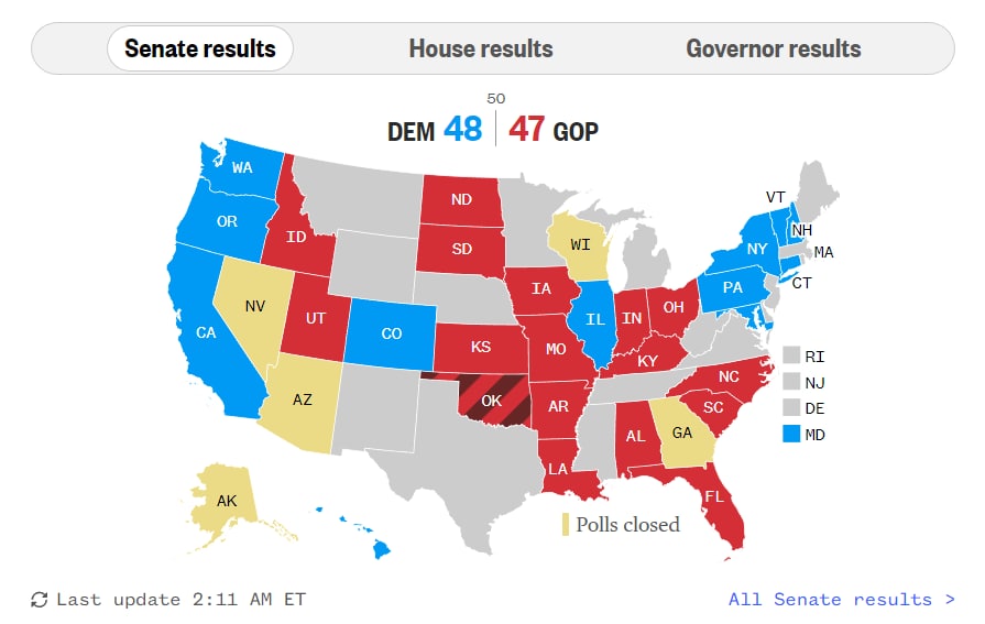 Напомним, по экзитполам республиканцы получают большинство в обеих палатах Конгресса.