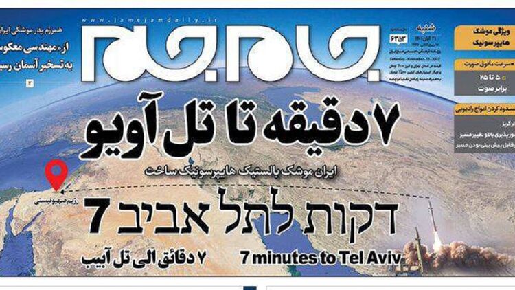 Заявление о создании иранской гиперзвуковой ракеты своеобразно проиллюстрировала иранская газета Jam-e-Jam. На первой полосе - огромный заголовок "7 минут до Тель-Авива", именно столько потребуется новой ракете, чтобы достичь Израиля с территории Ирана.
