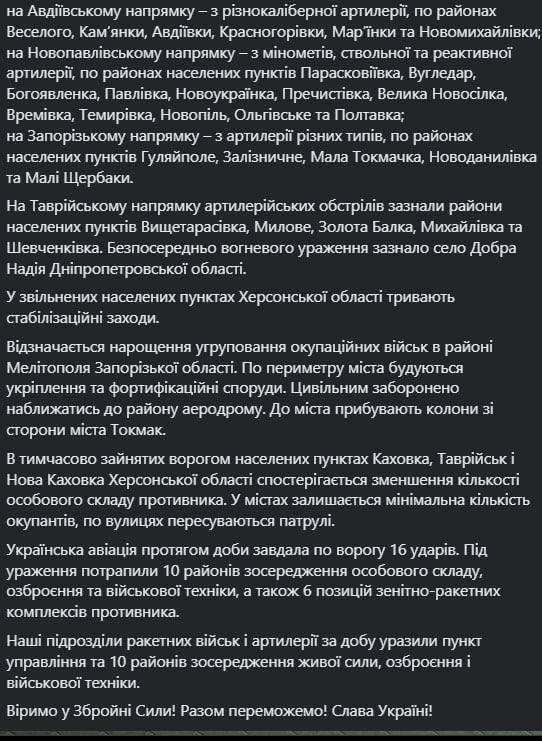 - Отмечается наращивание группировки противника в районе Мелитополя. По периметру города строятся укрепления и фортификационные сооружения. Гражданским запрещено приближаться к району аэродрома. В город прибывают колонны техники со стороны Токмака.