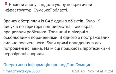 Россияне нанесли удар по критической инфраструктуре Сумской области. Три человека ранены, они находятся в больнице.