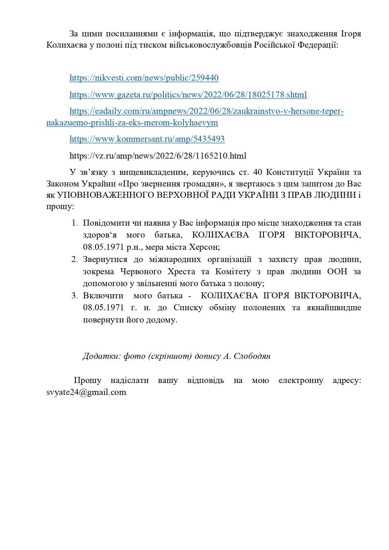 В своем обращении к уполномоченному Верховной Рады по правам человека он призывает привлечь к освобождению Колыхаева международные организации и включить мэра в список на обмен пленными.