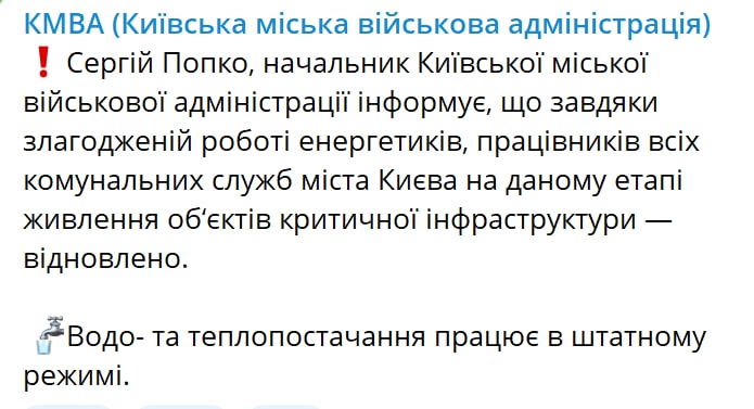 08.15 В Киеве восстановили энергопитание на объектах критической инфраструктуры, сообщил глава Киевской военной администрации Сергей Попко.