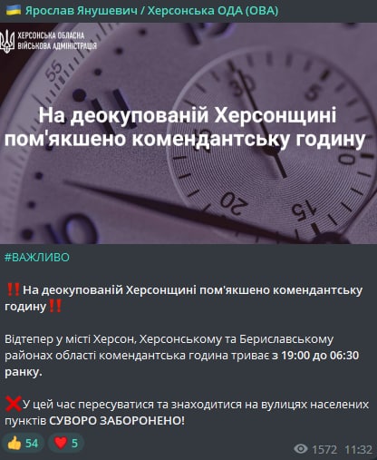 Теперь в Херсоне, Херсонском и Бериславском районах он действует с 19:00 до 6 утра.