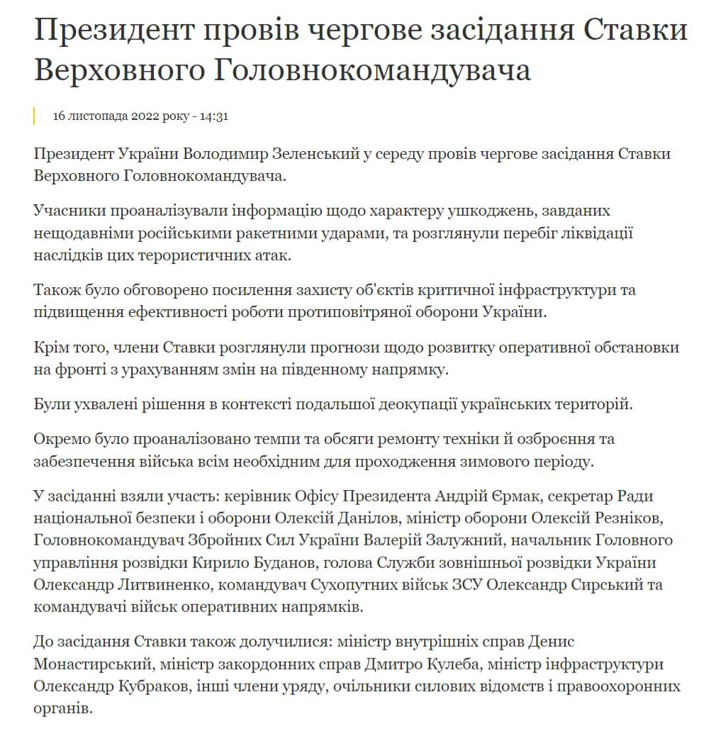 "15 ноября 2022 года произошел очередной многочасовой массированный обстрел всей территории Украины и ее объектов критической инфраструктуры, который вели вооруженные силы Российской Федерации.