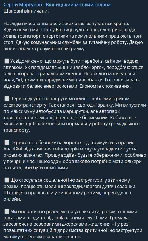 "Замечу, что объекты критической инфраструктуры снабжены генераторами и альтернативным источником питания. Также идет ликвидация последствий вчерашних обстрелов", – добавил он.