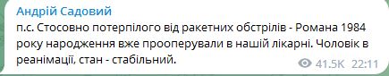 06.30 Мэр Львова Андрей Садовой сообщил, что в результате удара РФ пострадал мужчина 1984 года рождения. Его прооперировали. Он находится в реанимации. Состояние стабильное.