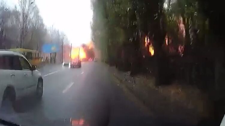 Видео снято с автомобильного видеорегистратора. За несколько секунд до удара по дороге, как раз в сторону места попадания, ехали несколько машин. После сильного взрыва вспыхнул пожар, авто завернули на ближайшую улицу.