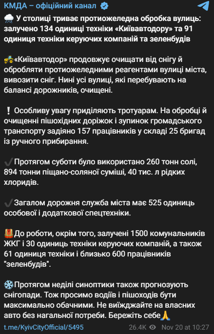 Кроме того, в столице продолжается противогололедная обработка улиц, привлечены 134 единицы техники "Киевавтодора" и 91 единица техники управляющих компаний и зеленстроев. При этом, как сообщает КГГА, все улицы уже очищены от снега.