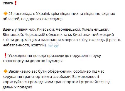 Днем в северных, Киевской, Черновицкой, Хмельницкой, Винницкой, Черкасской областях и Киеве значительный мокрый снег и дождь, местами налипание мокрого снега, гололедица.