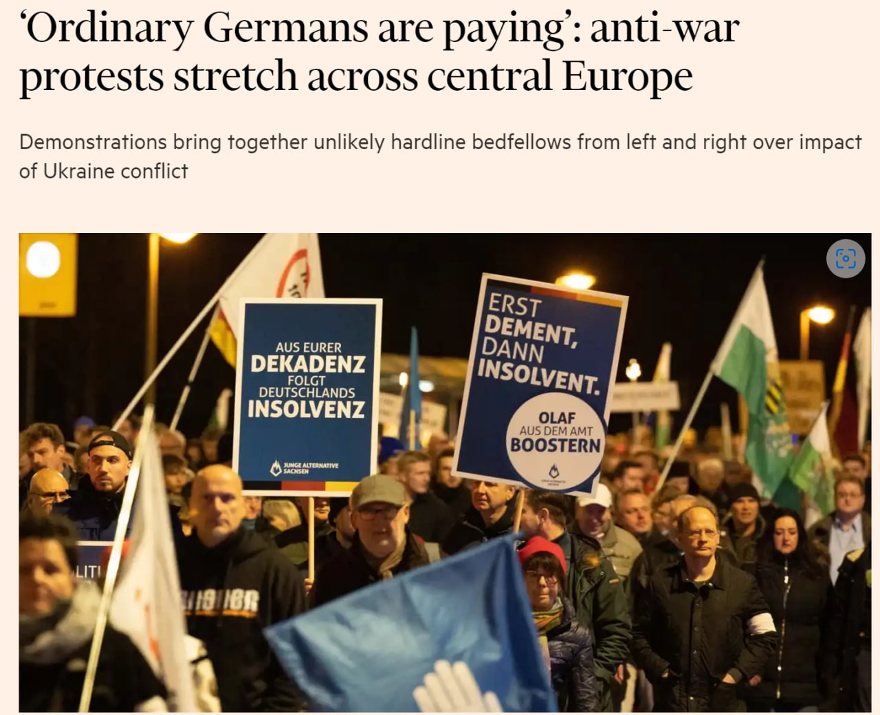08:30 Издание Financial Times пишет о волне протестов против продолжения войны с Россией, которые разворачиваются в Восточной Германии.