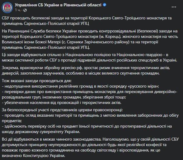 10:27 СБУ проводит обыски сегодня не только в Киево-Печерской Лавре, но и в двух монастырях и на территории Сарненско-Полесской епархии УПЦ в Ровенской области.