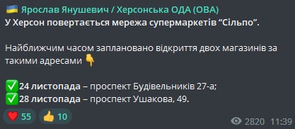 Компания возобновила свою работу в освобожденном городе менее недели назад, 16 ноября.